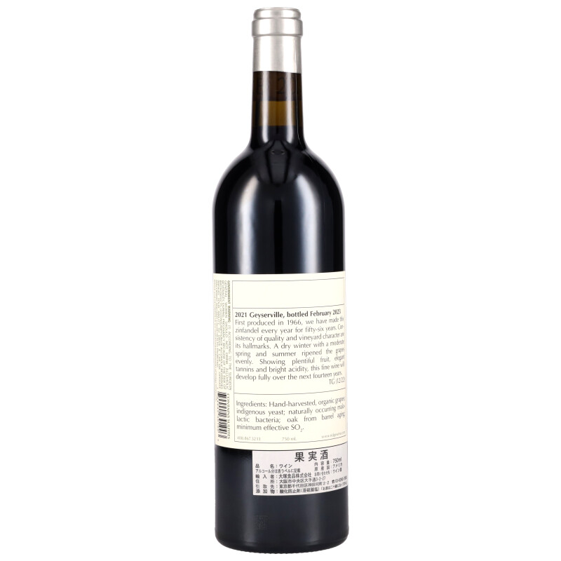 リッジが世界に誇る最高のジンファンデル。赤系果実の華やかな芳香にハーブやスパイス、オークの複雑な風味が重なって、その香りは万華鏡さながら。しっかりした美しい酸味としなやかなボディが特徴の、フィネスあふれるワイン。